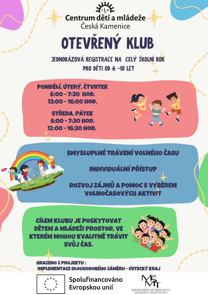 Cílem otevřených klubů nebude pouze poskytnutí prostoru pro setkávání, ale především vytvoření místa, kde by mohlo dojít k propojení různých skupin s cílem rozvinutí kompetencí, vzájemné pomoci, inspirace, motivace a spolupráce. Klub nabídne rozmanité aktivity, které budou reflektovat potřeby a zájmy návštěvníků, a zároveň budou podporovat rozvoj osobních a profesionálních dovedností. Dalším cílem je také zapojení účastníků do kolektivních činností a naučit je více spolupracovat v kolektivu a lepe komunikovat s vrstevníky. Aktivity budou realizovány zábavnou formou, např. plnění úkolů ve skupinách s pomocí pracovních listů, aby účastníci získali nové znalosti, dovednosti a zkušenosti. Smyslem otevřených klubů je nabídnout mládeži široké spektrum aktivit, a účastníci tak budou mít možnost vyzkoušet různé činnosti a smysluplně využít svůj volný čas. Pro realizaci těchto činností bude pořízen také nezbytný drobný hmotný majetek.